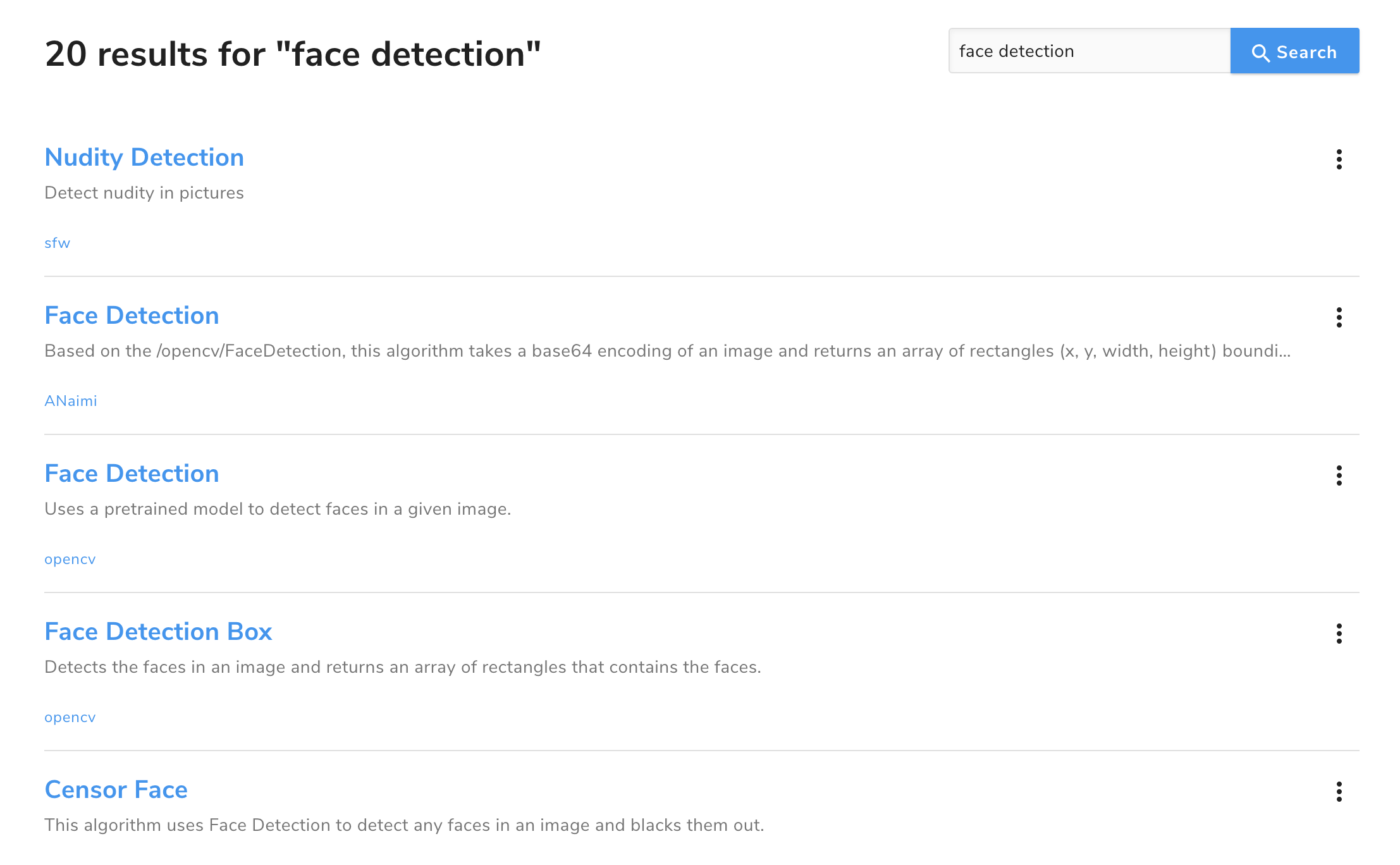 To get started, find an algorithm you’d like to call. You can do this by using the search bar or browsing the marketplace by tags & categories: