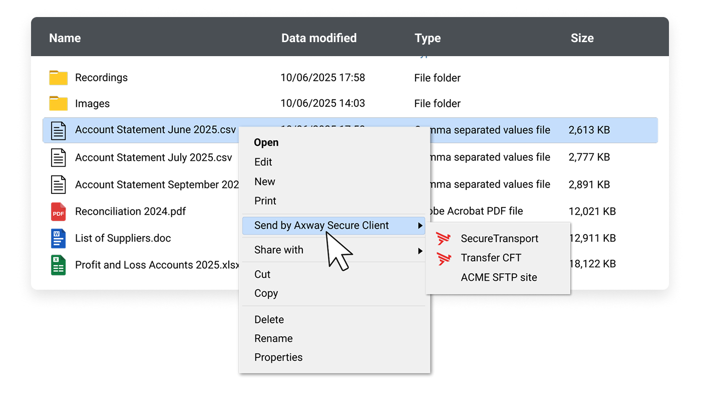 Secure Client is ideal for organizations with — and those who need to connect to — SecureTransport and/or Transfer CFT instances or other MFT servers in a secure manner.