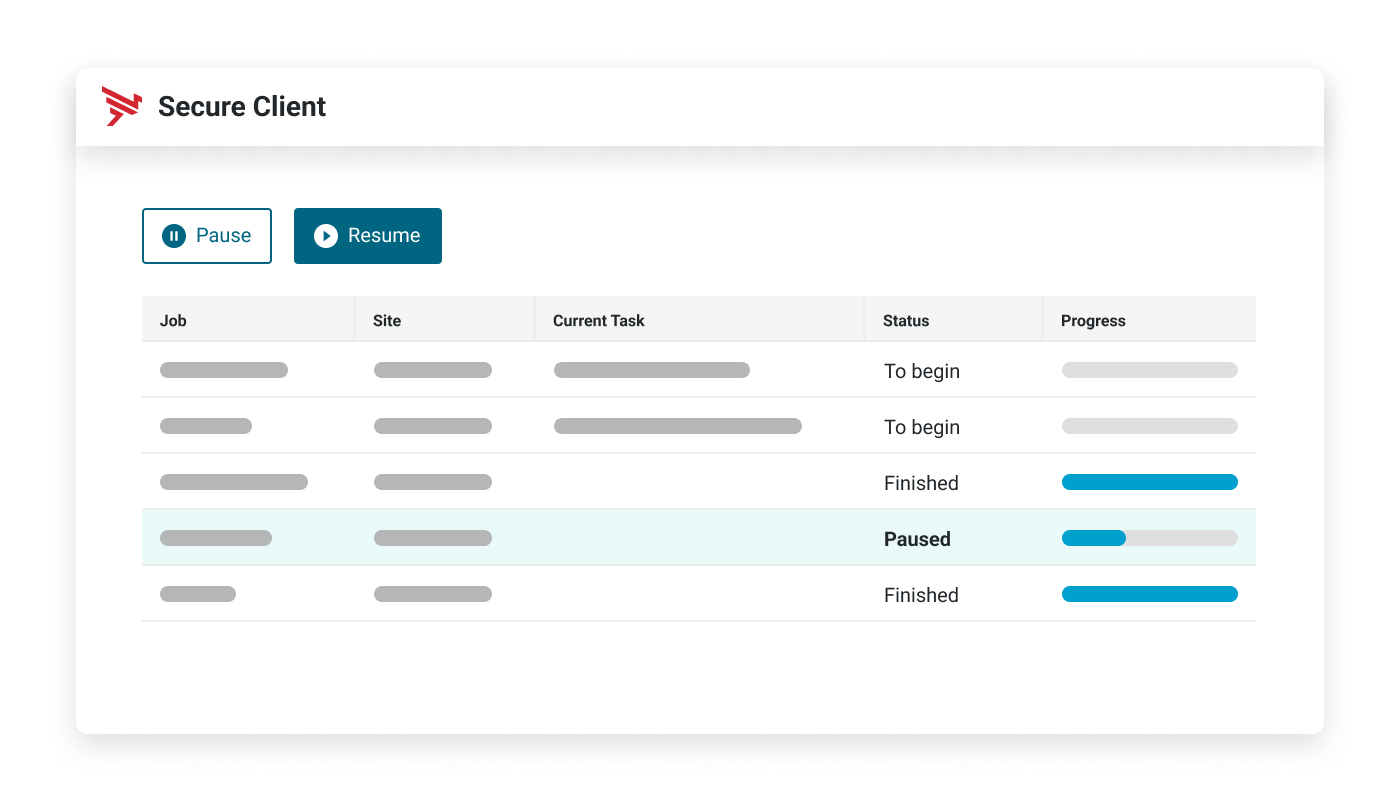 - Where file transfers may have stopped for any reason, Secure Client allows for the resumption from the point of failure in cases of FTP(S) and HTTP(S) use.
