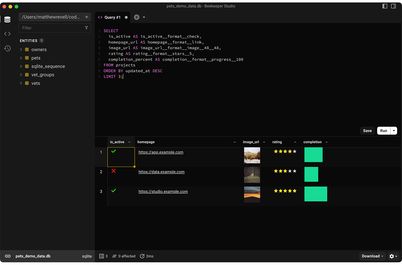 Transforme resultados SQL simples em saída visual e legível — estrelas, barras de progresso, checks, imagens, links, saltos de tabela e códigos legíveis — onde você consulta. saiba mais >