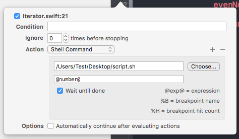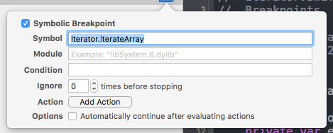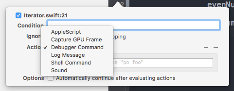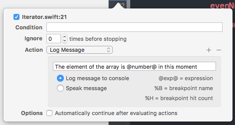 Since we are using Swift, we can ignore the options Exception and Break since they are more useful if we use Objective-C or C++—therefore we can leave the default values. Then, like the normal breakpoint, we have the options Action and Continue After Evaluating.