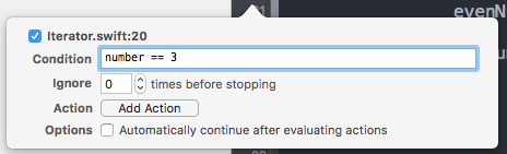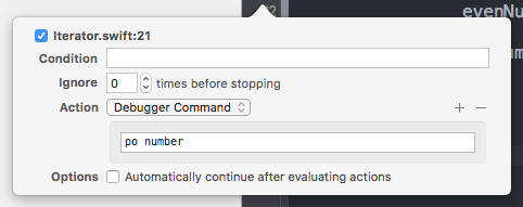 The last option available is Continue After Evaluating. With this option enabled, the breakpoint doesn’t pause the execution. It’s useful when combined with the actions, since we may have some actions which shouldn’t pause the app execution.