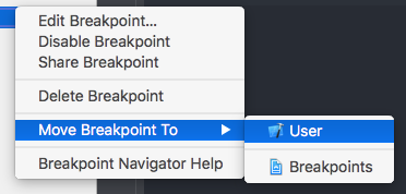 Moving the breakpoint to User, we will allow Xcode to add that breakpoint in all our projects. Therefore, if we move a breakpoint to User and then open a new project, we will find the same breakpoint in both projects.