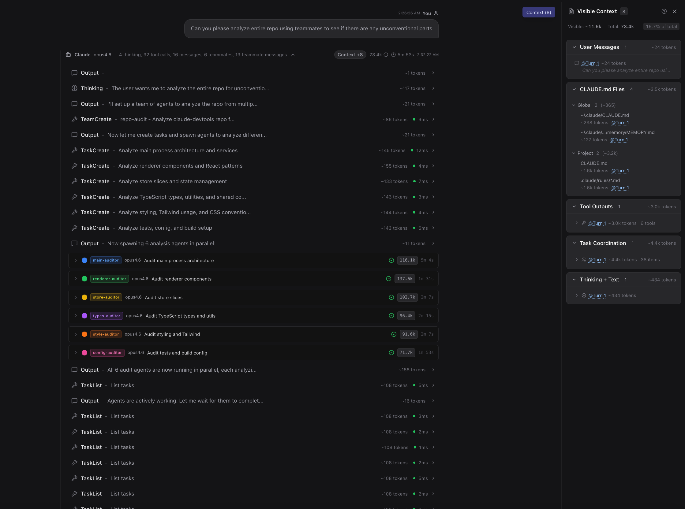 Per-turn token attribution across 7 categories — CLAUDE.md (global, project, directory), skill activations, @-mentioned files, tool I/O, thinking, team overhead, user text. Visualizes how your context fills, compresses during compaction, and refills — so you can see exactly what was in the window at any point.