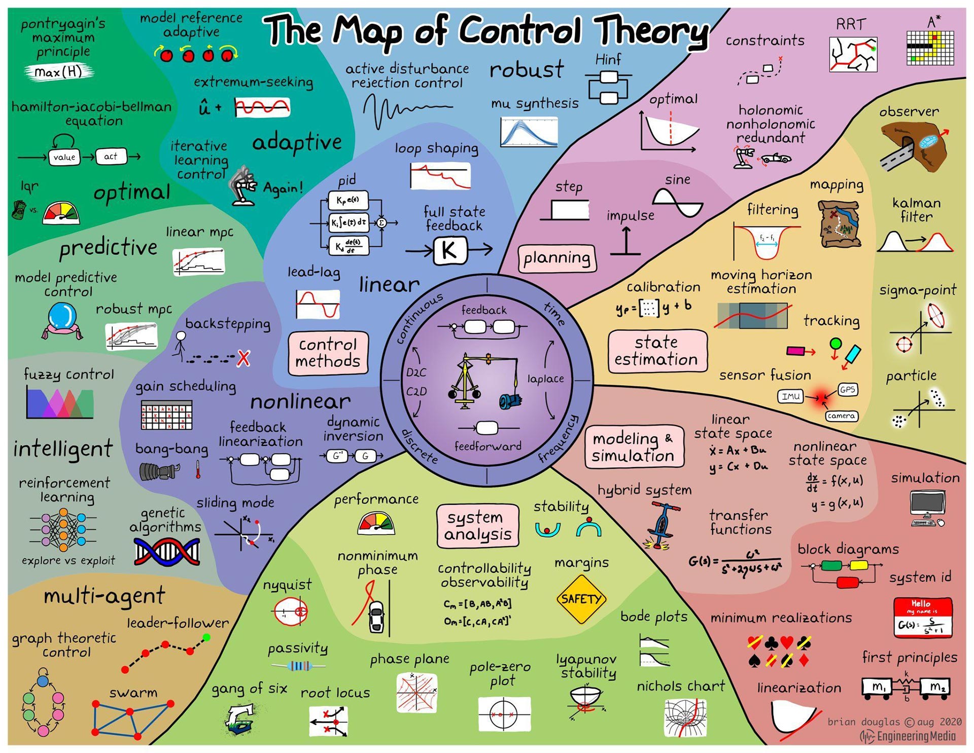 最开始的 The Map of Mathematics 里，控制理论缩在右下角的角落，画了一个典型的反馈控制框图代表了这些内容，若把这一小块继续展开，就会得到更完整的[the map of control theory](https://www.youtube.com/channel/UCq0imsn84ShAe9PBOFnoIrg)：