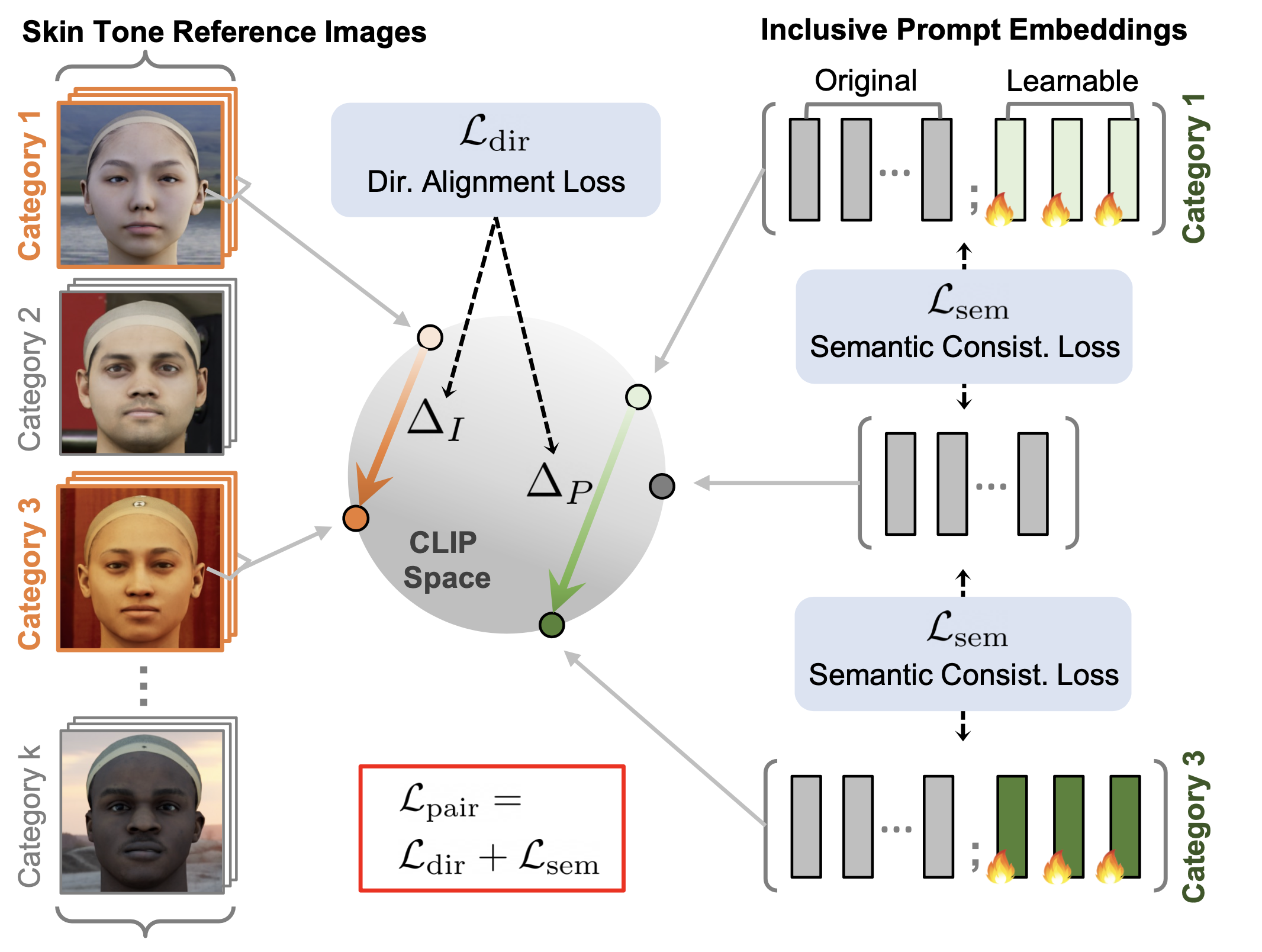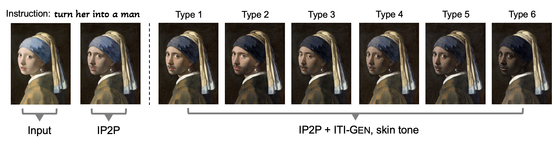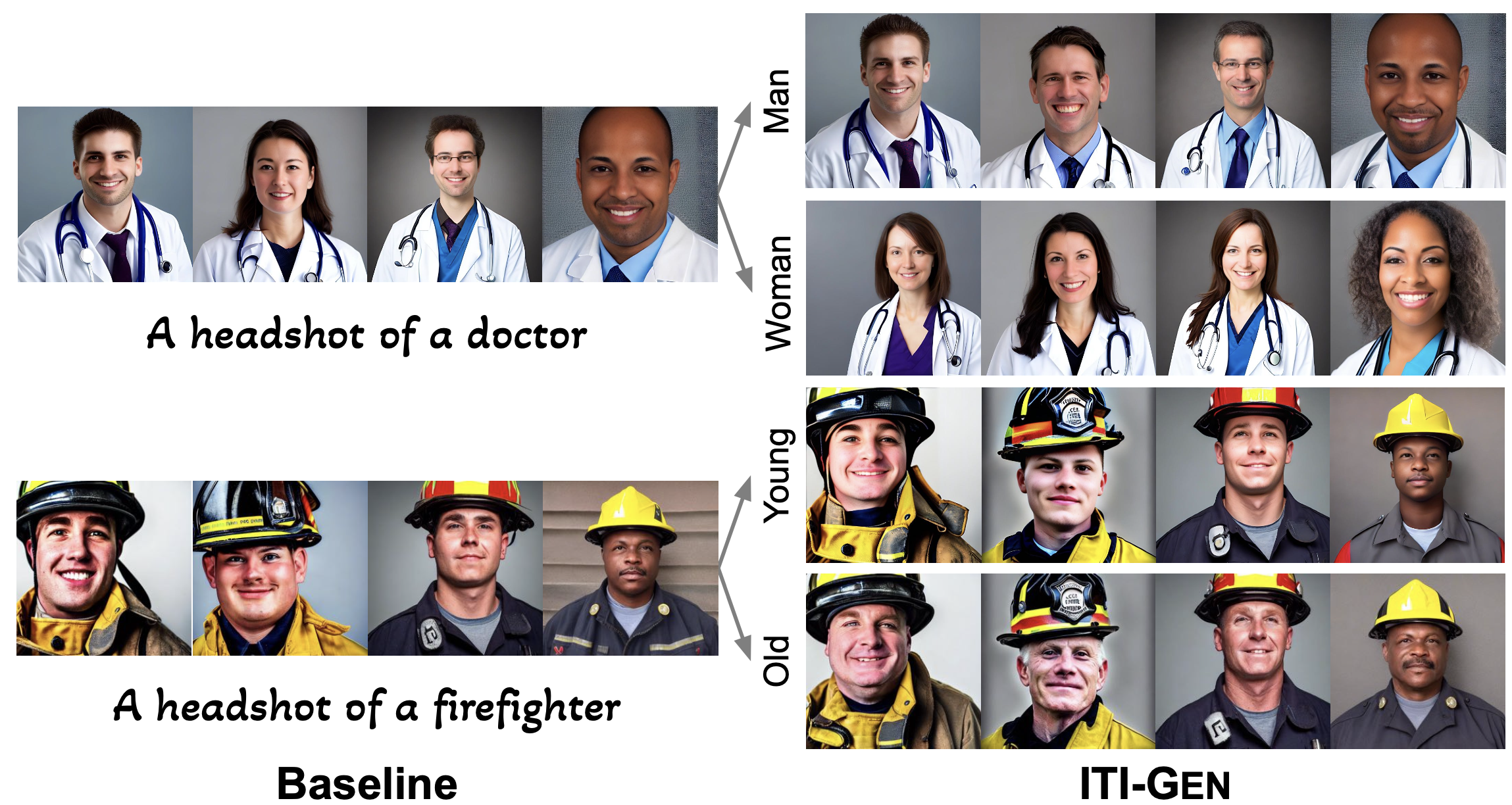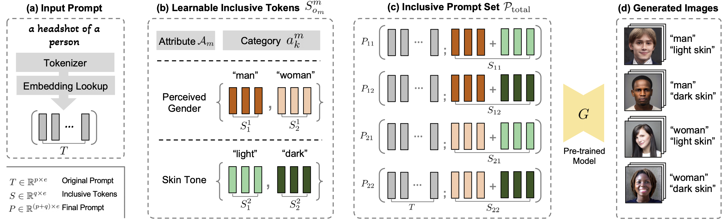 Illustration of Inclusive Text-to-Image Generation with the example of two binary attributes: perceived gender and skin tone. (a) Given an input prompt, (b) ITI-GEN learns discriminative token embeddings to represent each category of every target attribute. (c) By injecting the learned tokens after the original input prompt, ITI-GEN synthesizes an inclusive prompt set that can be used to (d) sample equal (or controllable) numbers of images for any category combination. Further, our framework can be easily extended to multi-category multi-attribute scenarios of inclusive text-to-image generation. Note that, in practice, multi-category skin tones beyond {“light”, “dark”} as in this example may be challenging to specify with language.