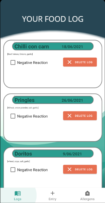 Our app allows users to track the food they've eaten and helps them identify potential causes of their allergic reactions. A user inputs the food item they have eaten (either through scanning product barcodes or manually entering recipe ingredients) and this is recorded on a log along with the date. On each food log entry, there is a checkbox for whether they have then had a negative reaction and started feeling ill after eating the product. If so, the ingredients of the product are analyzed to find a correlation with other foods that have resulted in a negative reaction to see if there are any shared ingredients. As the user scans more items, the app can narrow down which specific ingredients are the likeliest cause of the reaction.