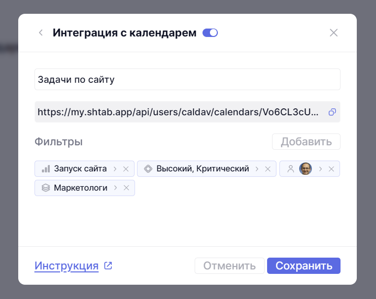Здесь вы сможете создать новую ссылку для интеграции и настроить какие задачи вы хотите видеть, например, только по определенному проекту или же только где вы исполнитель.