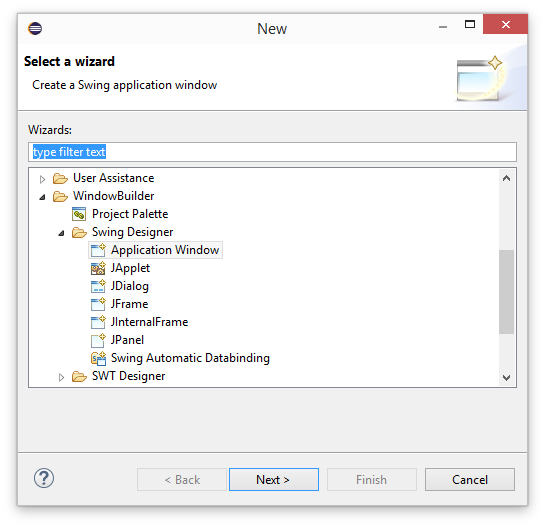 Scroll down to the WindowBuilder folder and expand it. Then expand the 'Swing Designer' folder and select 'Application Window'. Finally click 'Next'.