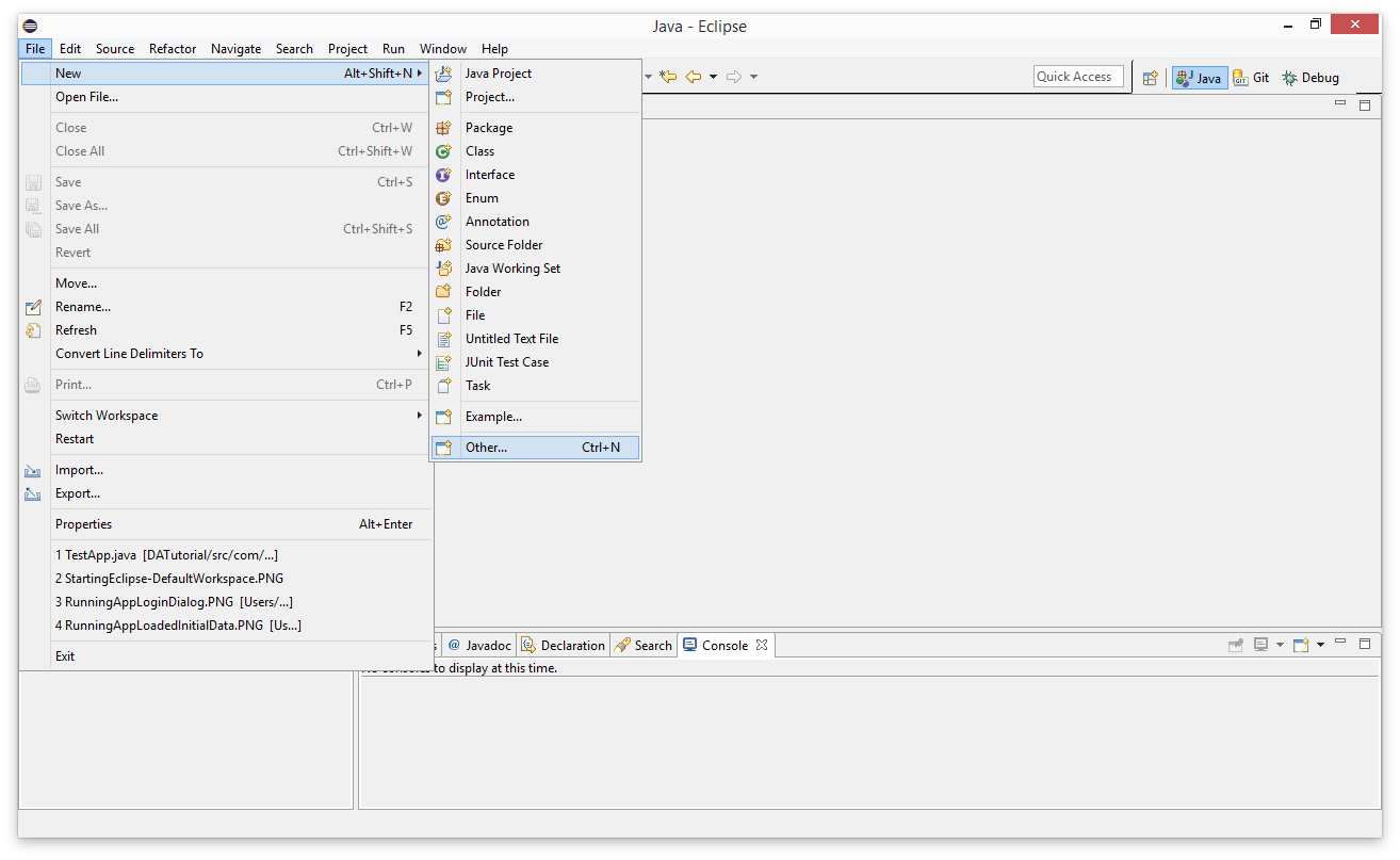 Once it has been installed, select 'File->New->Other' in Eclipse.