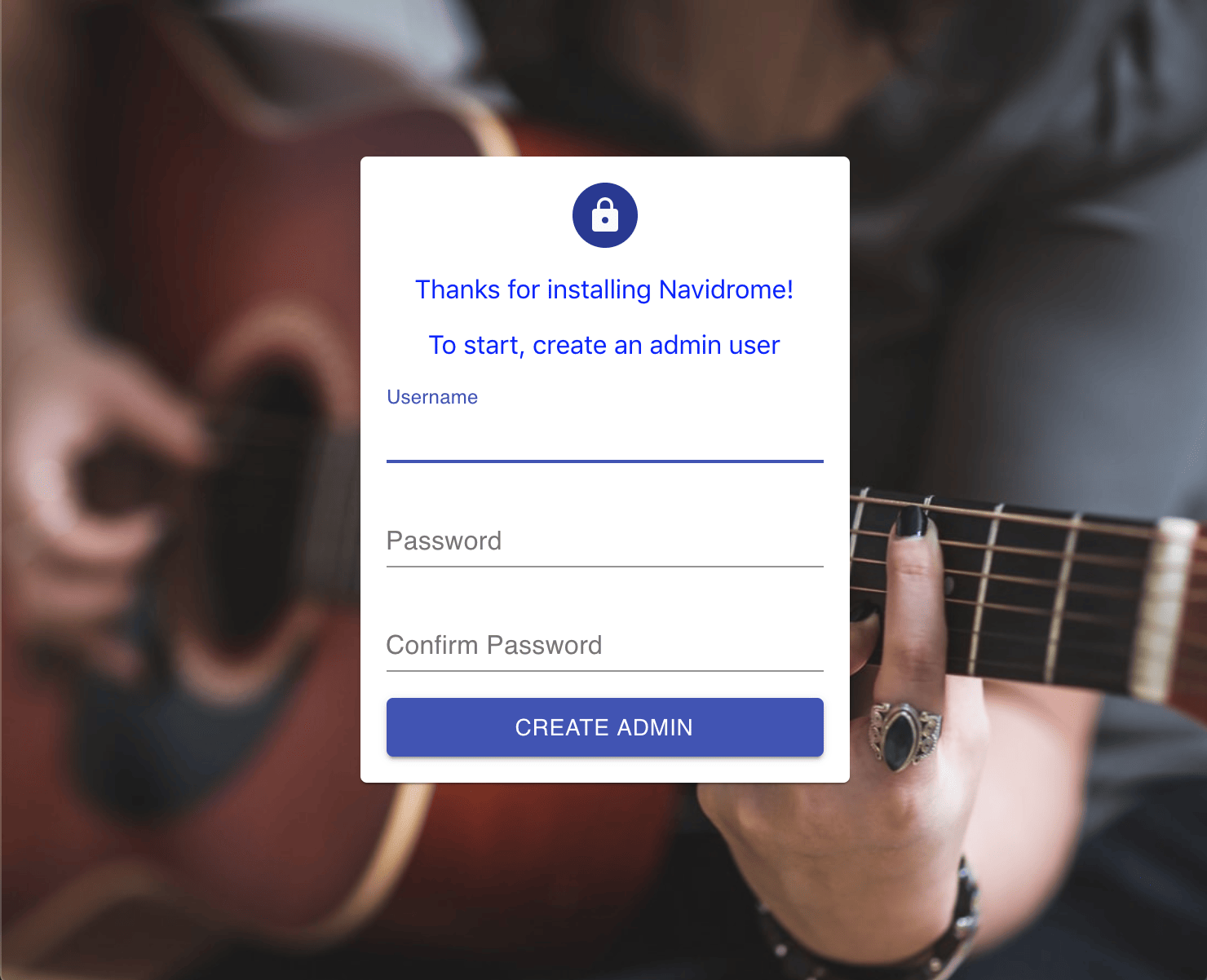 After installing Navidrome in your platform, you need to create your first user. This will be your admin user, a super user that can manage all aspects of Navidrome, including the ability to manage other users. Just browse to Navidrome’s homepage at https://navidrome.iYOUR_DOMAIN_NAMEi and you will be greeted with a screen like this: