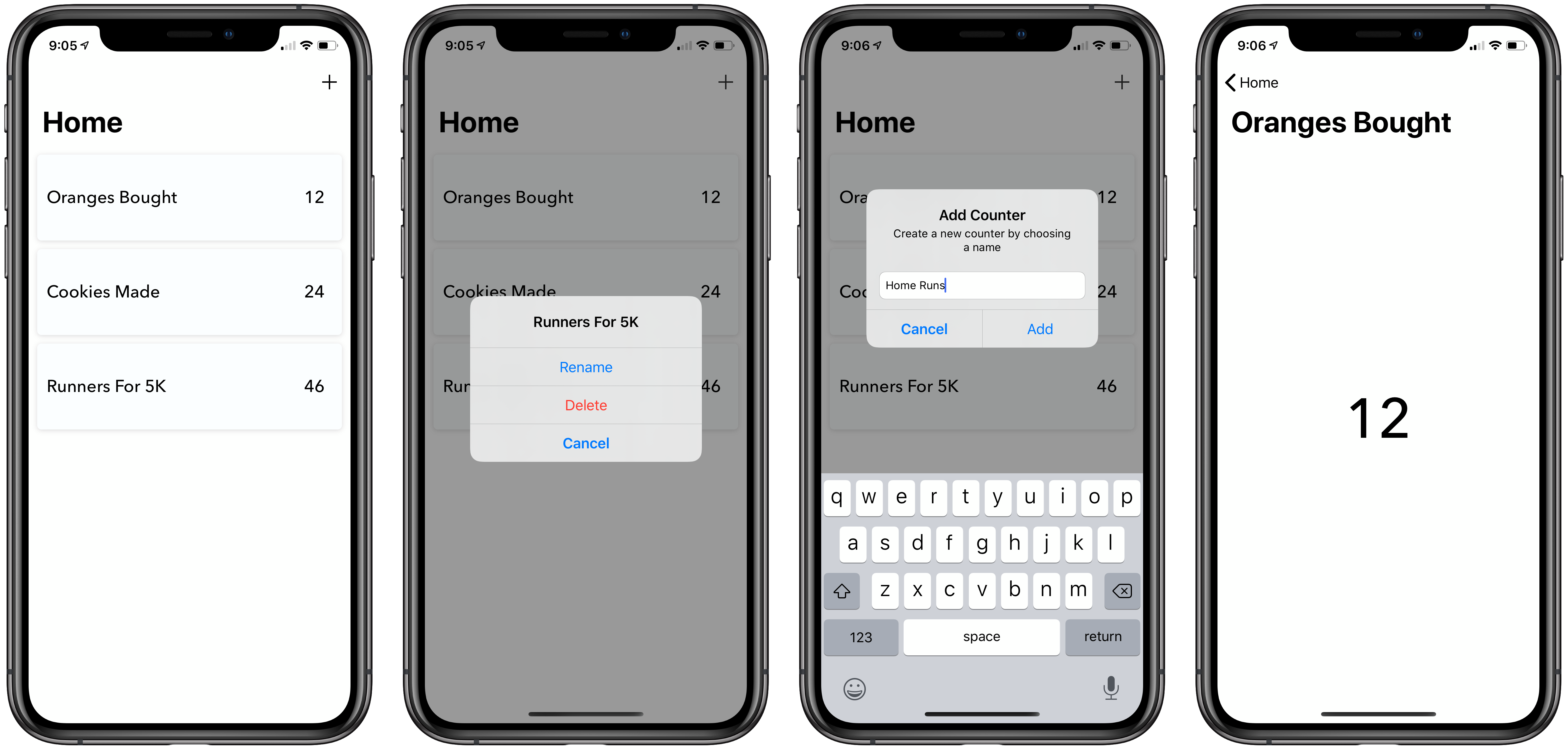 My idea with this app was to make it dead simple to use. I didn't want there to be any confusion on how it worked. You click the + button when you load up the app to create a new counter, give it a name, then either swipe up or down in the next screen to increase or decrease your count, it's that simple!