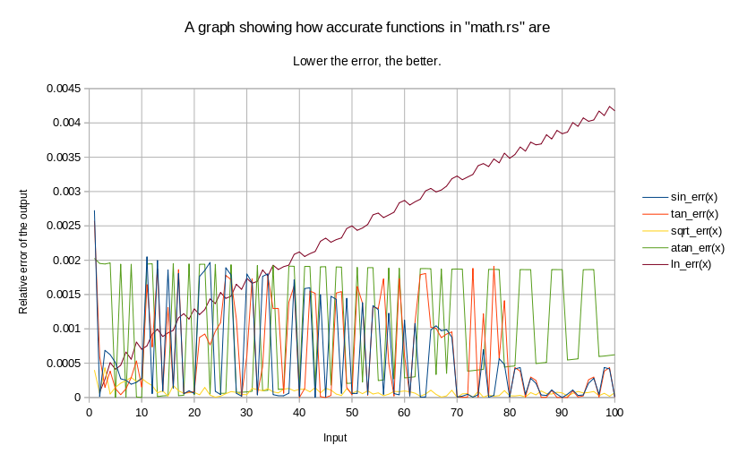 By the way, if you ever find yourself having to use a programming language without a built-in math library, here is an example of how to make a simple math library in less than 150 lines of code. You can also see a diagram showing how accurate the functions there are for various inputs. (I had to do that in my programming language when writing Analog Clock for WebAssembly, because WebAssembly doesn't provide fsin and similar instructions.)