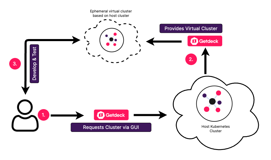 With Getdeck you only need one host Kubernetes cluster that runs the operator. Getdeck creates Kubernetes clusters as deployments in a matter of seconds. The operator creates several ways to connect to that cluster and makes it simple to get started working with Kubernetes.