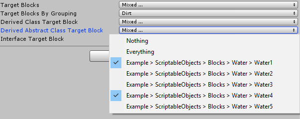 [ScriptableObjectMultiSelectDropdown(typeof(IBlock))] public ScriptableObjectReference interfaceTargetBlock;