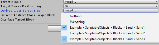 [ScriptableObjectMultiSelectDropdown(typeof(SandBlock))] public ScriptableObjectReference derivedClassTargetBlock;