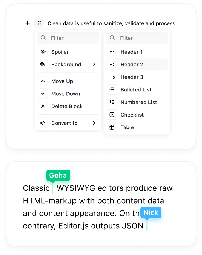 Editor.js outputs a clean JSON data instead of heavy HTML markup. Use it in Web, iOS, Android, AMP, Instant Articles, speech readers, AI chatbots — everywhere. Easy to sanitize, extend and integrate with your logic.