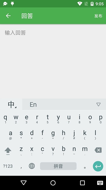 在问题详情界面,点击右下角的FloatingActoinButton跳转到添加回答界面AddAnswerActivity,用户可以在里面输入自己对问题的回答,然后点击右上角的发布按钮进行发布。