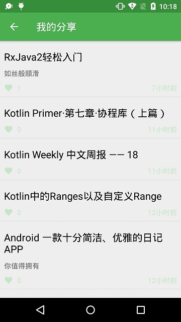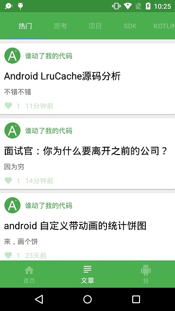 完成文章分享后,我们就可以在文章界面ArticleFragment查看用户分享的文章了。在ToolBar中包含TabLayout,里面放置着文章标签:热门、思考、项目、SDK、Kotlin、自定义控件、第三方和面试。TabLayout与ViewPager绑定,每个标签对应一个文章列表的Fragment,点击文章列表条目,就能够进入文章详情,查看文章内容,并且可以收藏喜欢的文章。