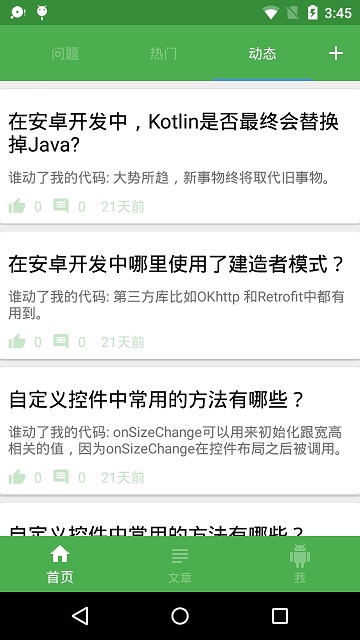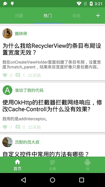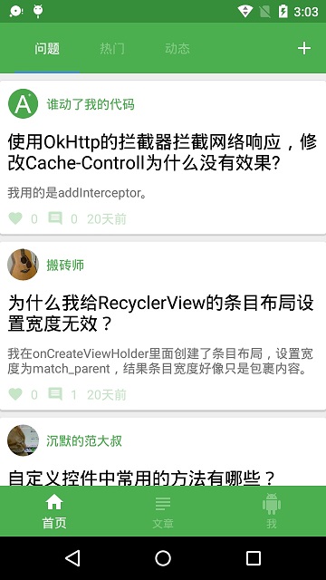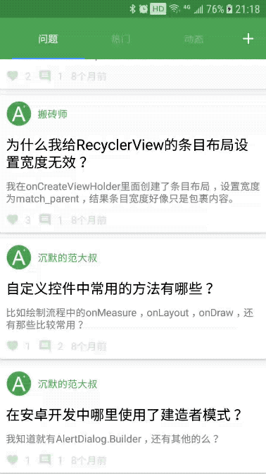 首页界面顶部为Toolbar,并内部包含一个TabLayout,Tablayout显示三个页面标题:问题、热门、动态。另外TabLayout绑定一个ViewPager,ViewPager内部又有三个子界面:问题界面,热门界面,动态界面。用户点击首页右上角,可进入添加问题界面。