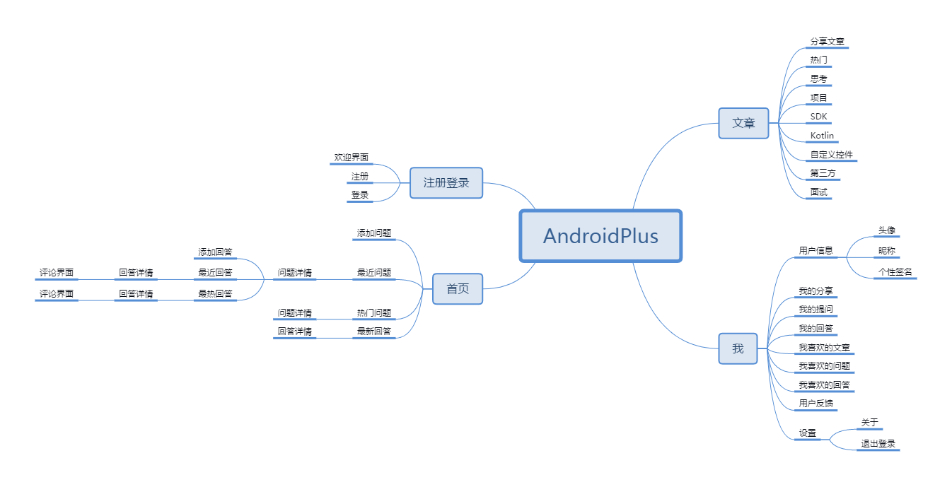 AndroidPlus主要分为四大块:注册登录、首页、文章、我(个人中心)。用户首先进入的是注册登录模块,当用户打开App时,会显示一个欢迎界面,若用户没有登录,则进入登录界面。用户没有注册账号,还可以点击注册按钮进入注册界面。用户注册登录后就进入主界面。主界面分为三大模块,分别为首页、文章和我,点击底部导航条可以进行三个模块的切换。主界面默认显示为首页,在首页中,用户可以添加问题,并可分为三个页面:最近问题列表、热门问题列表和最新回答列表。当用户点击最近问题列表或者是热门列表的问题条目时,会进入问题详情页面,在问题详情页面中,可以添加对问题的回答,并且显示最近回答列表和最热门回答列表;当用户点击回答列表的回答条目时,就会进入回答详情;在回答详情页面中,用户可以点赞或者是跳转到评论界面查看评论或者写评论。在文章界面,根据文章类别可分为热门、思考、项目、SDK、Kotlin、自定义控件、第三方、面试,并且可以在别的应用中分享文章到AndroidPlus。在个人中心——“我”中,会显示用户的相关信息,如头像、昵称、个性签名,另外可查看用户的分享、提问、回答、喜欢的文章、喜欢的问题、喜欢的回答,用户可以在用户反馈中跟产品运营反馈问题,在设置选项中可退出登录。