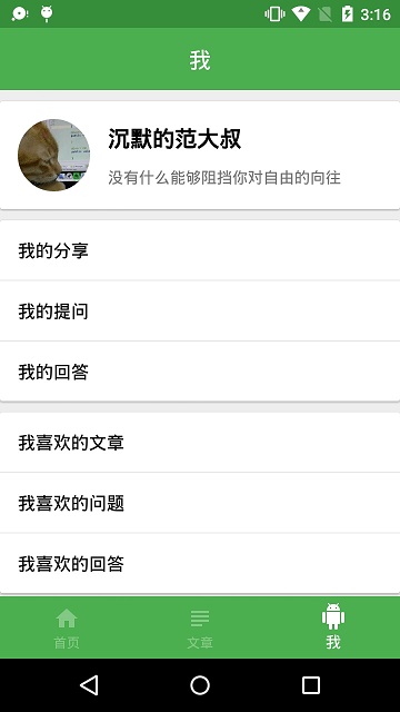 主界面的最后一个页面是个人中心MeFragment。第一个卡片里面摆放用户头像、用户名和用户签名,点击都能进行修改;第二个卡片摆放用户的分享、提问和回答;第三个卡片是用户喜欢的文章、问题和回答;第四个卡片在最后面,摆放着用户反馈和设置。
