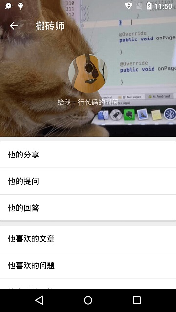 展示的是当前登录用户的数据,如果想查看其他用户的数据怎么办呢?事实上,我们可以点击问题列表或回答列表条目中的用户的头像或用户名即可跳转到用户详情界面ProfileActivity。