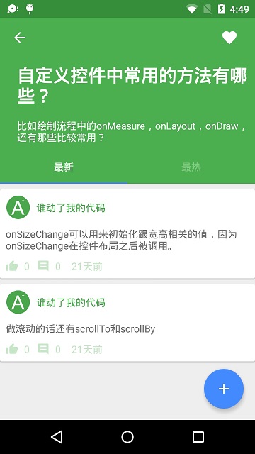 当我们点击问题界面和热门界面的条目时,就能跳转到问题详情界面。问题详情显示问题标题与描述,下面是一个ViewPager展示最新的回答和最热门的回答列表。