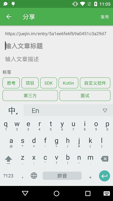 当用户在其他应用中读到精彩Android开发的文章时,可以点击分享按钮,在弹出的应用列表中选择AdroidPlus(应用名Android+),跳转到分享界面ShareArticleActivity。在ShareArticleActivity中,文章的URL自动填写出来,文章的标题和描述需要用户自行输入,然后还必须给文章选定一个标签,才能够发布文章。