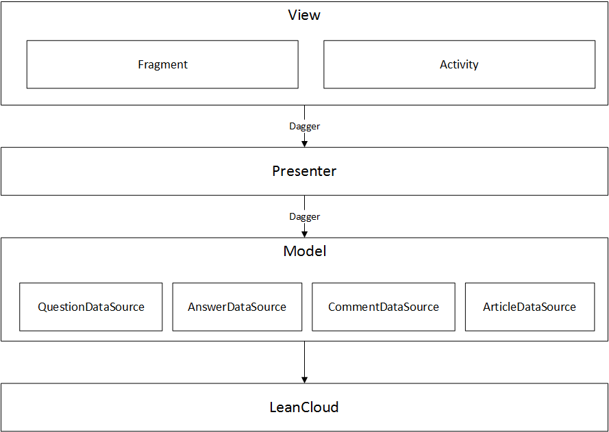 AndroidPlus的架构采用MVP + Dagger + LeanCloud。使用MVP将程序划分层次,使用Dagger来降低MVP中层与层之间的耦合,作为个人开发者,独自搭建后台服务器比较耗时,可以选择第三方云数据库来完成产品的快速实现。在MVP的Model层中,我们进行了模块化处理,将数据源进行切割,分成了问题数据源QuestionDataSource、回答数据源AnswerDataSource、评论数据源CommentDataSource、文章数据源ArticleDataSource。在当前版本中,数据源由LeanCloud实现,如果后续更换服务器接口(比如使用自己搭建的服务器),只需要用新的网络接口实现Model层的一套数据源接口,替换掉LeanCloud即可。