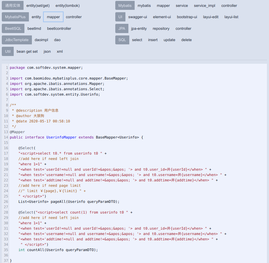 | 20200517 | 1.代码重构!异常处理优化,Freemarker相关工具类优化,简化模板生成部分,通过template.json来配置需要生成的模板,不需要配置java文件. 2.修复包含comment关键字时注释无法识别的问题.(感谢@1nchaos的反馈). 3.赞赏优化,感谢大家的赞赏. 4.新增mapper2(Mybatis-Annotation模板)(感谢@baisi525和@CHKEGit的建议). |