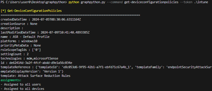 Similarly you can identify all Intune managed devices and details belonging to a specific user by supplying their Entra User ID or their User Principal Name using the --id flag: