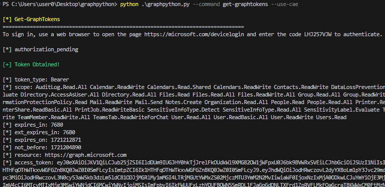 Obtain MS Graph tokens via device code authentication (can also be used for device code phishing):