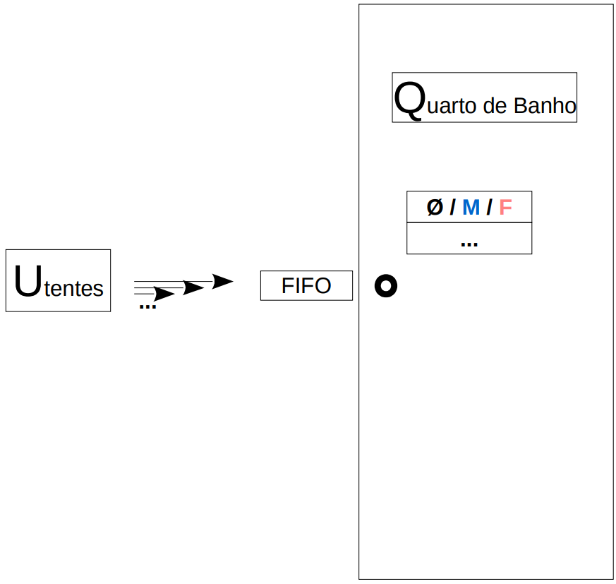 Pretende-se obter uma aplicação do tipo cliente-servidor capaz de lidar com situações de conflito no acesso a zonas partilhadas. A zona partilhada é um Quarto de Banho com vários lugares unisexo, controlado por um processo Q ao qual se dirigem pedidos de acesso de utentes. Os pedidos de acesso são enviados por intermédio de um processo multithread U (cliente), e neles se indica o tempo que o interessado deseja estar num lugar das instalações sanitárias. Os pedidos ficarão numa fila de atendimento até terem vez; nessa altura, o utente respetivo acede a um lugar nas instalações durante o tempo pedido, sob o controlo do servidor Q; depois o recurso é libertado para outro utente. A aplicação deve ser desenvolvida em 2 etapas, de complexidade crescente, a segunda baseando-se no bom funcionamento da primeira. No final, e para avaliação, deverão ser entregues dois pacotes de código (com os programas U/Q), um para cada etapa.