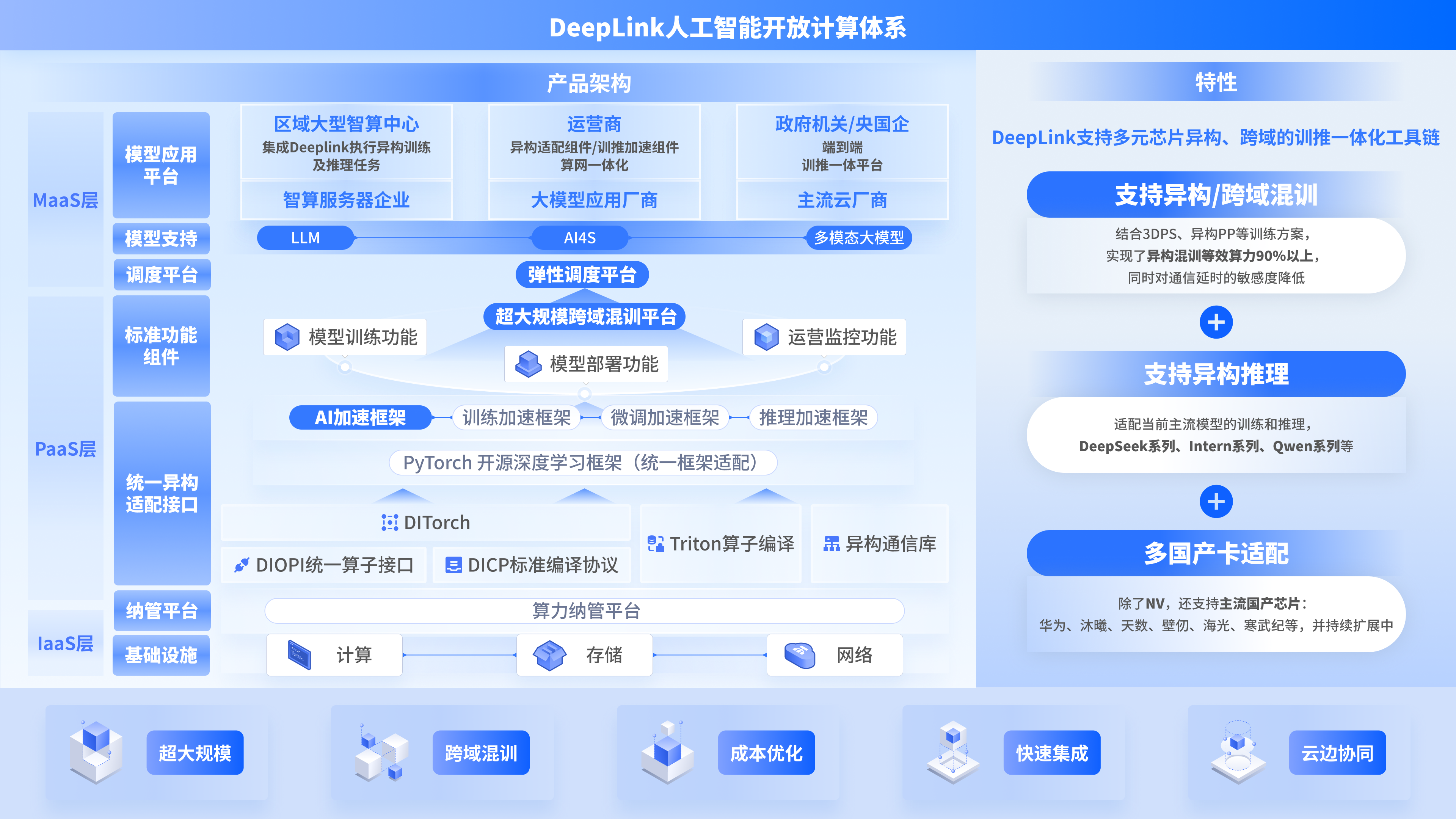 人工智能开放计算平台-DeepLink,作为芯片与深度学习框架适配的“桥梁”,根本性实现软硬件解耦,建设开放的软硬件适配生态。基于 DeepLink,可支持国产多芯片异构、跨域的训推一体化工具链(输入输出标准化);上下游厂商通过一次适配即可深度接入算法生态,从根本上打破生态壁垒,实现软硬件解耦和算力要素多样化。
