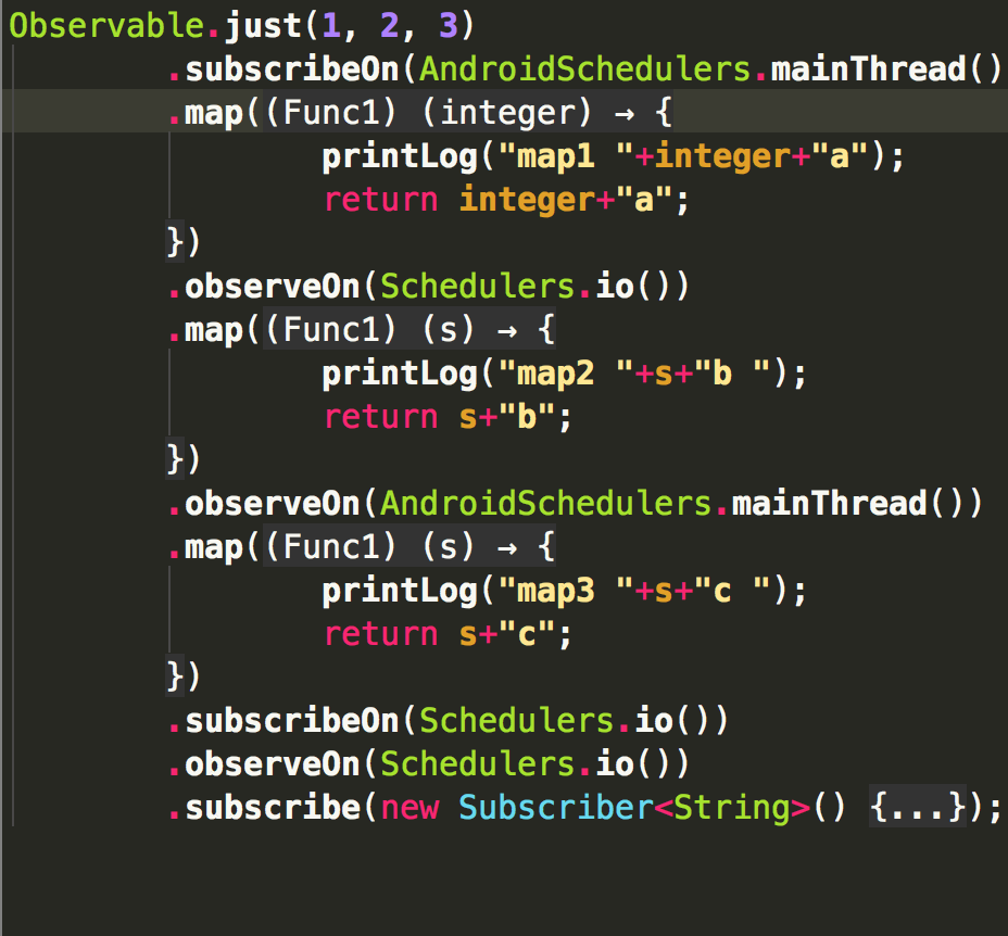 7.这个例子不同的是使用了两次subscribeOn()来指定被观察者的线程,最终最上面的subscribeOn()起作用,下面的subscribeOn()不起作用。然后使用Map对数据转换,这里只是在每个数据后面加‘a’,使用Schedulers.io()切换线程,然后使用Map变换,每个数据后加‘b’,再用AndroidSchedulers.mainThread()切换主线程,用Map对数据加‘c’,最后再切换到非主线程,输出结果。