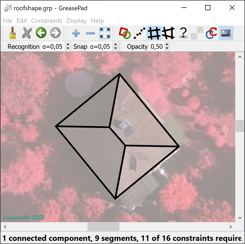 The GreasePad provides a drawing area and expects pen strokes as the only user input. These strokes are approximated by straight line segments leading to line drawings. During this interactive process, geometric relations such as orthogonallity are recognized and automatically enforced by an adjustment procedure. The program can be utilzed to analyse systems of straight lines and constraints (theorem proving) or to outline the shapes of human-made objects in images. As a pointing device, you can use a computer mouse, a stylus, or one of your fingers in combination with a touchscreen.