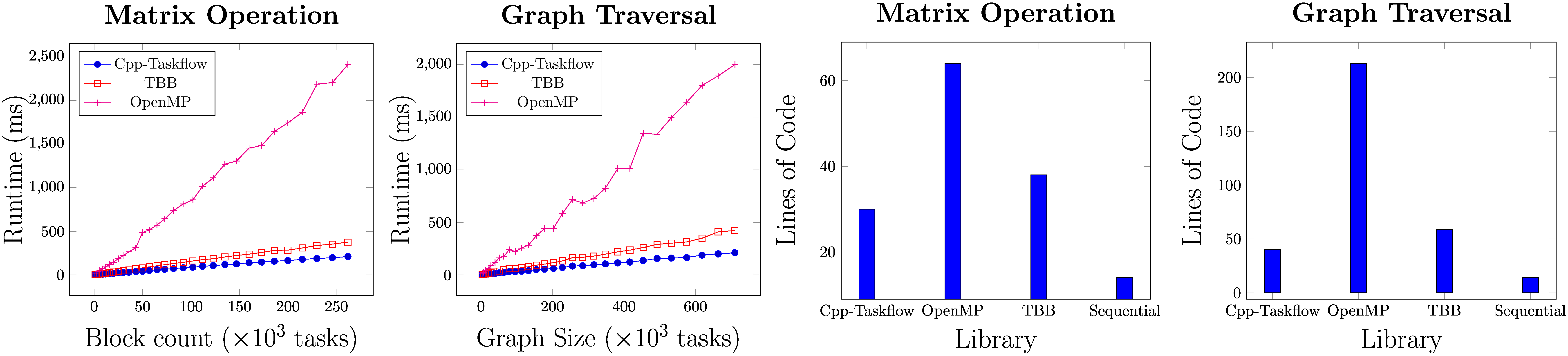 Cpp-Taskflow is by far faster, more expressive, and easier for drop-in integration than existing task programming frameworks such as OpenMP Tasking and Intel TBB FlowGraph in handling complex parallel workloads.