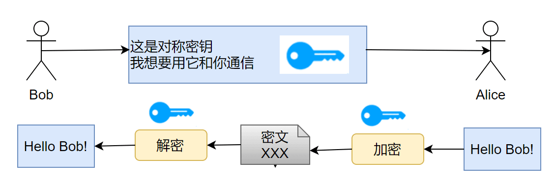 对称加密:通信双方共享唯一密钥 k,加解密算法已知,加密方利用密钥 k 加密,解密方利用密钥 k 解密,保密性依赖于密钥 k 的保密性。