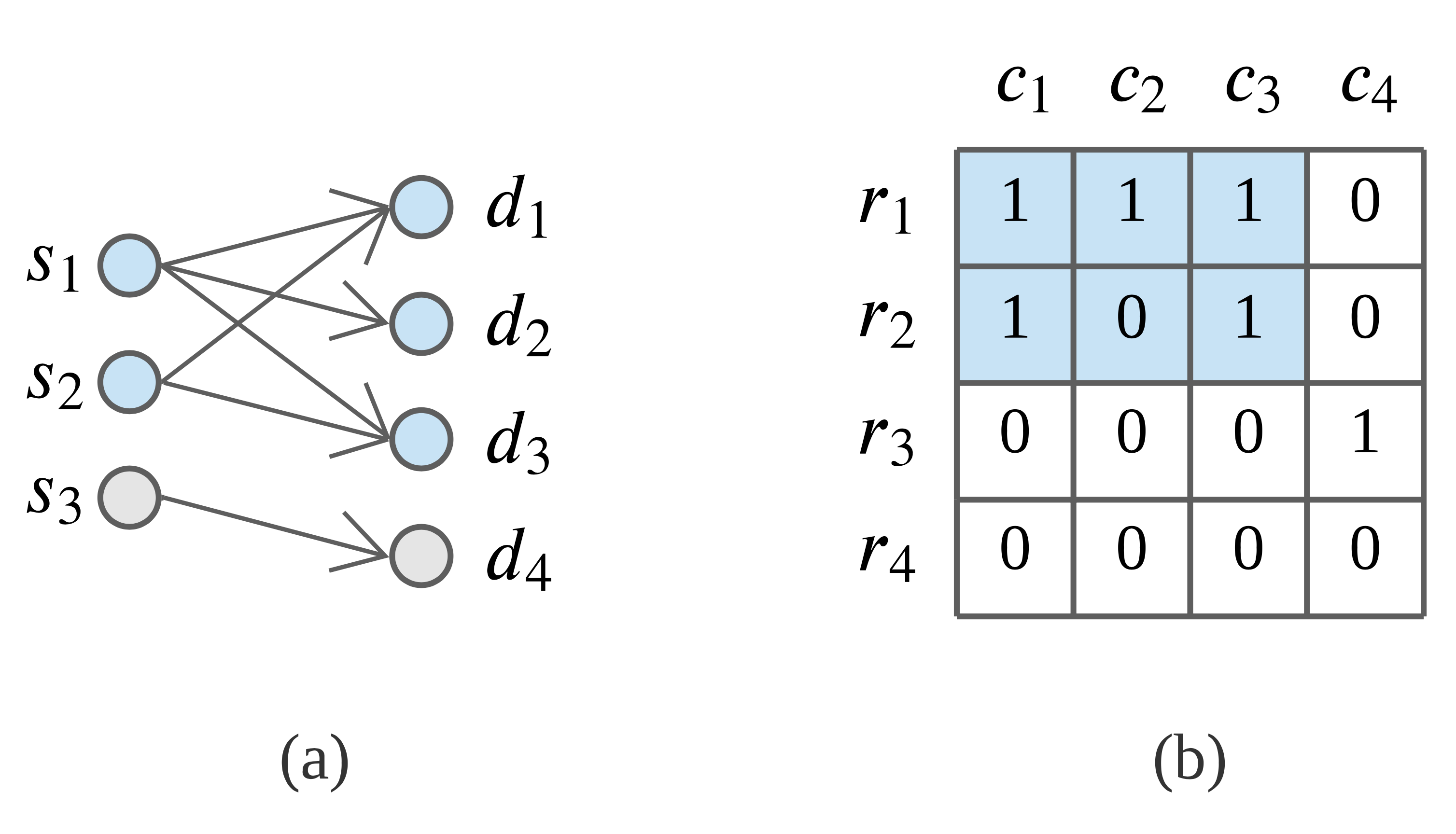 (a) Dense subgraph in the original graph between source nodes s1, s2, and destination nodes d1, d2, d3 is transformed to a (b) Dense submatrix between rows r1, r2, and columns c1, c2, c3 in the higher order CMS.