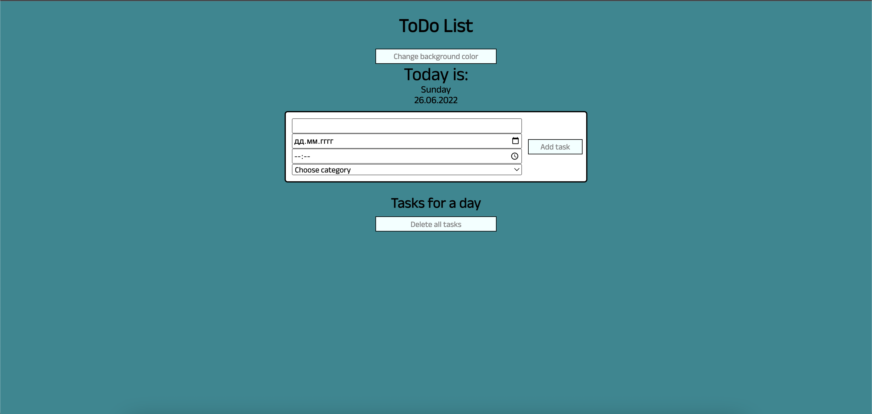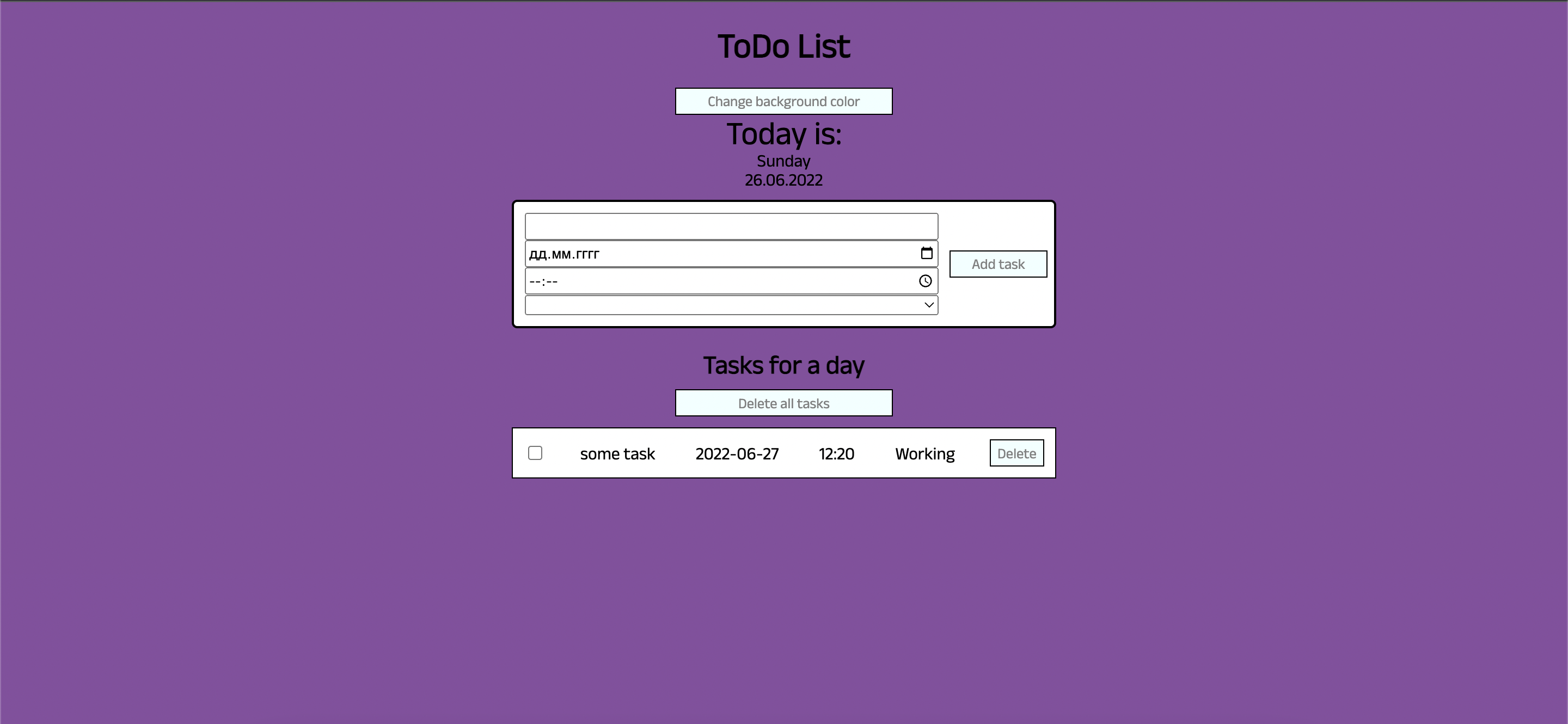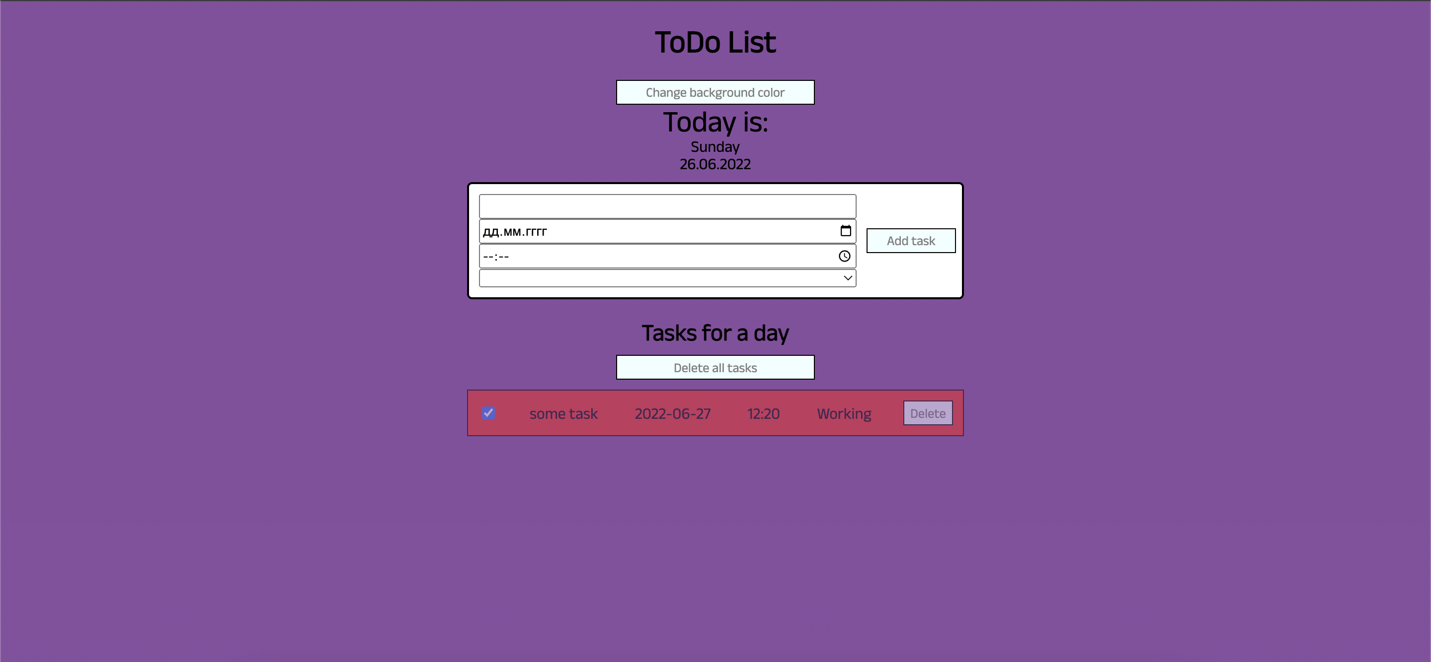 To add new task you need to enter your task, choose deadline and category: 'Personal' or 'Working', then press 'Add task'.