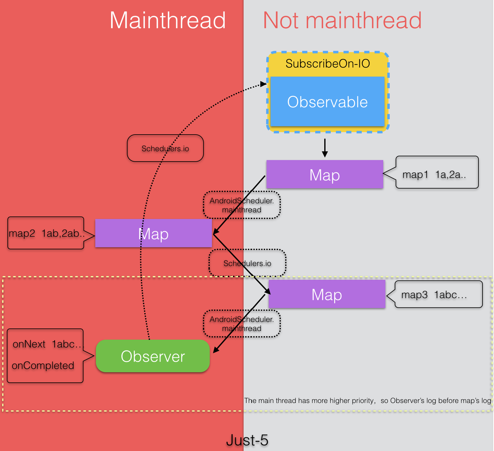 ####5. 使用Schedulers.io()指定被观察者产生事件的线程,使用Map对数据转换,在每个数据后面加‘a’,使用AndroidSchedulers.mainThread()切换到主线程,然后使用Map变换,每个数据后加‘b’,输出结果。