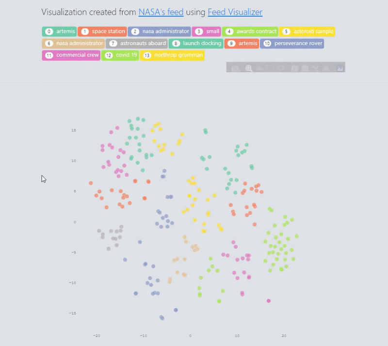 Feed Visualizer is a tool that can cluster RSS/Atom feed items based on semantic similarity and generate interactive visualization. This tool can be used to generate 'semantic summary' of any website by reading it's RSS/Atom feed. Shown below is an image of how the visualization generated by Feed Visualizer looks like. If you like this tool please consider giving a ⭐ on github !