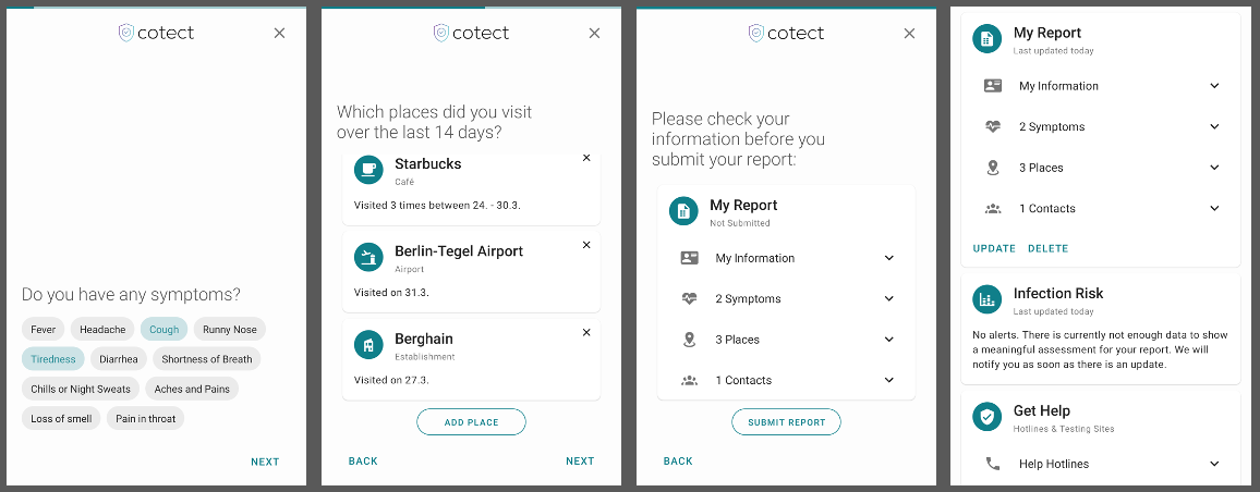 Cotect allows anyone to anonymously report their symptoms with relevant meta-information such as visited places or contacts. The user can update their case at any time to keep track of changing symptoms, new contacts, or place visits. Cotect combines this data without storing any personally identifiable information. The user has full control over what information is reported and can delete this data at any time.