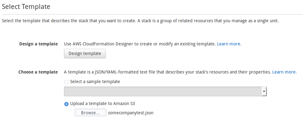 On the option "Upload a template Amazon to S3" click on "Browse..." button and select the file you downloaded as a pre-requisite