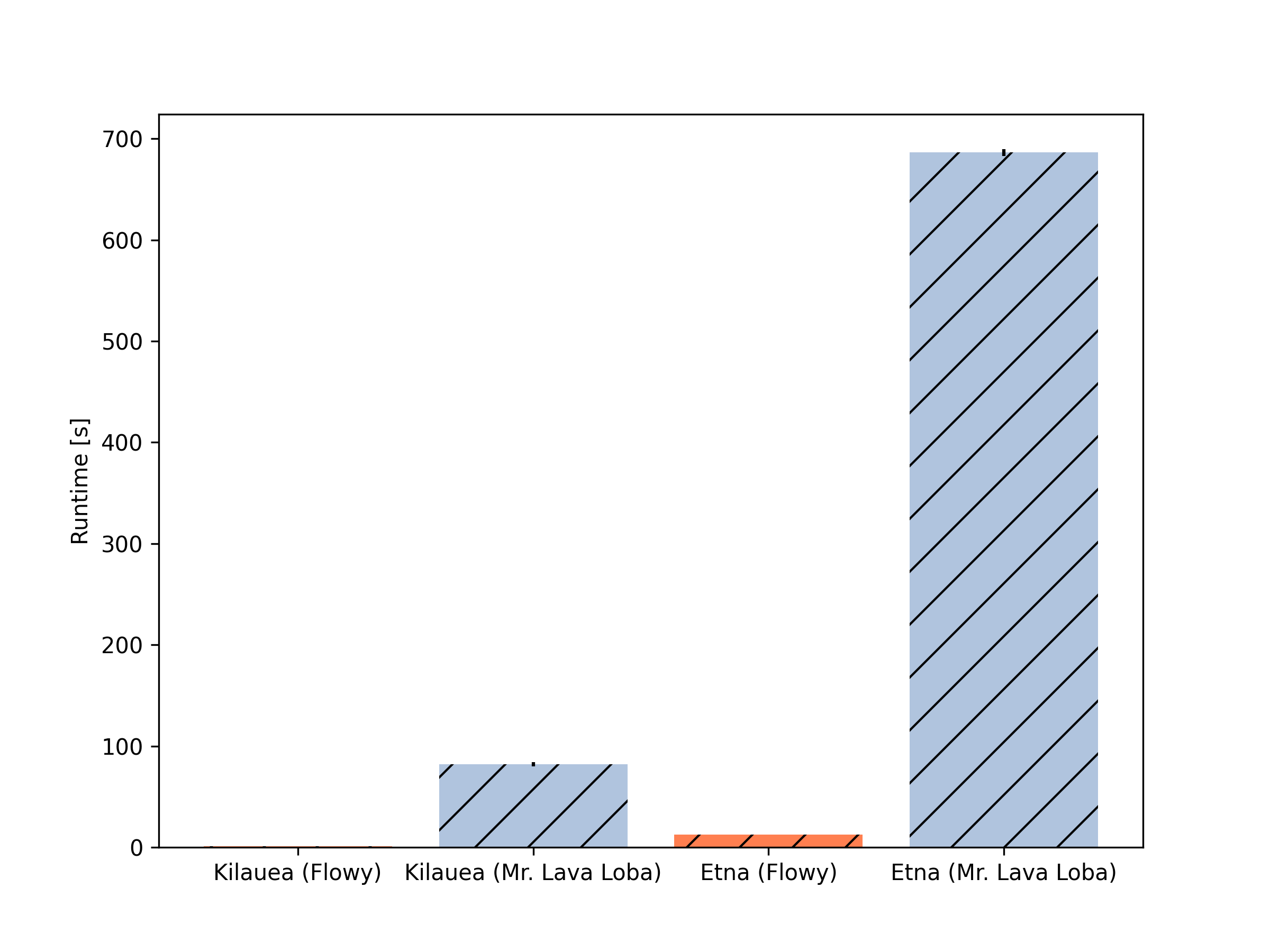 Both codes were run on the examples and the runtime was averaged over 10 runs. Flowy is about 100 times faster on the Kilauea example and about 50 times faster on the Mt. Etna example.
