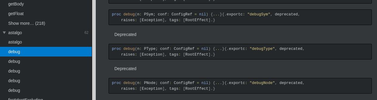 The module 'astalgo' has five 'debug' entries, where three are procedures with different arguments and two are templates. Any idea or suggestion to improve this would be helpful.