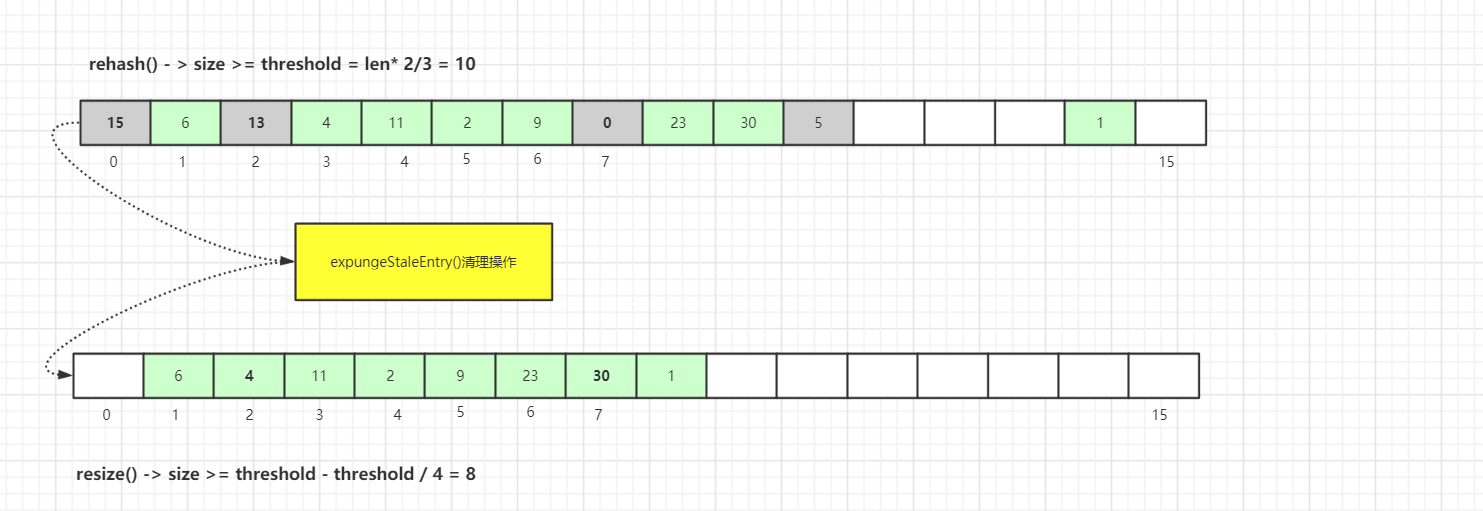探测式清理是以当前Entry 往后清理,遇到值为null则结束清理,属于线性探测清理。