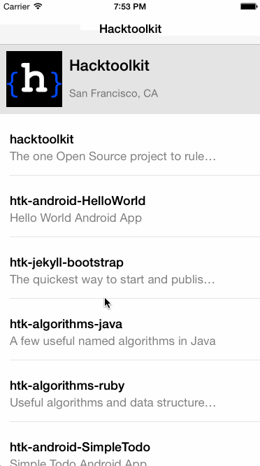 - Drill-down navigation of GitHub repositories and popping in/out of Navigation Controller