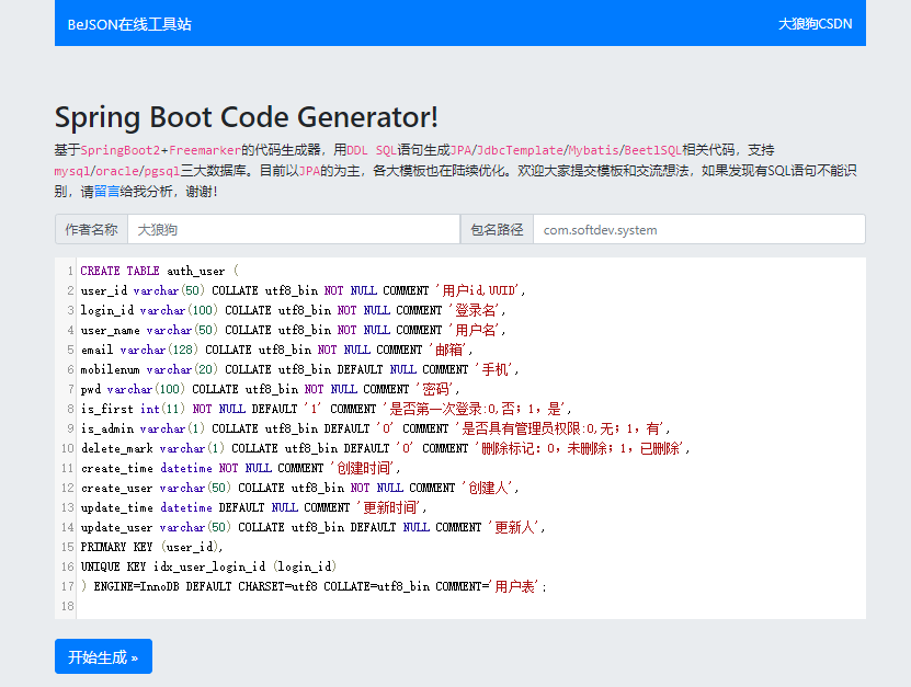 基于SpringBoot2+Freemarker的代码生成器,用DDL SQL语句生成JPA/JdbcTemplate/Mybatis/BeetlSQL相关代码,支持mysql/oracle/pgsql三大数据库。以释放双手为目的,各大模板也在陆续补充和优化。欢迎大家提交模板和交流想法!